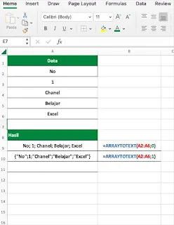Rumus ARRAYTOTEXT berfungsi untuk menggabungkan nilai teks dari range tertentu dalam bentuk Array. Untuk menggunakan ini adalah Sintaks yang harus dituliskan ARRAYTOTEXT(array, [format]). Untuk format ada dua nilai yaitu 0 dan 1 jika selain itu maka akan di peroleh hasil #VALUE.